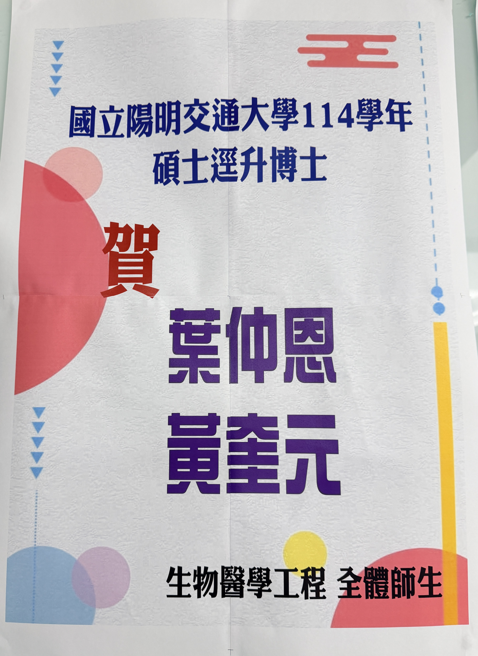 本學程110級畢業生黃奎元同學成績優異, 以應屆推甄方式, 成功錄取國立陽明交通大學--生物醫學工程學系〈生醫電子組〉的碩士班, 並在就讀一學期之後, 於今年(115年)2月已成功申請逕讀博士班, 未來將結合AI在生醫工程領域, 做更深入的研究與發展。